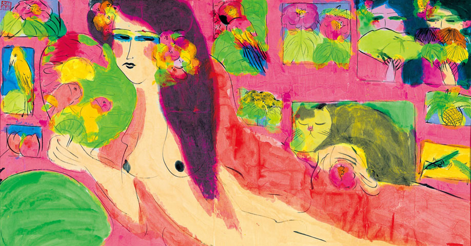 丁雄泉一向擅長于對女人、花、鳥和動物的描繪,透過畫筆分享這自然世界的秀麗。他運用鮮紅、大綠等繽紛色彩,使畫作顯現充沛的活力與新鮮感。其畫裡最大的特色即是,色與色之間對比的呼應極融洽協調,更引人注目的是,色塊與色塊之間,並沒有既定的輪廓線著色,而有一種滲透混合的運動姿態。1977年古根漢基金會提供獎學金,出版一本畫集《朱唇》,收錄有一系列情色素描及繪畫。《紅妝》一作,以女人為主題。畫面上,單色背景上勾勒了出草蟲花鳥的輪廓,充滿著一種視覺的驚喜。丁雄泉熟悉的透過鸚鵡、花朵、貓兒來襯托女性的嬌媚與溫柔,此作品宛如春天萬物的縮影,給人春意盎然的感受。