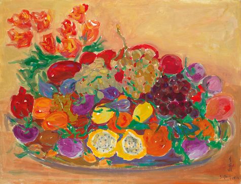 簽名右下:李芳枝 Li Fang 1997 ; 簽名題識畫背:迎春大吉好彩頭 靜物 油畫 72 x 96 cm 一九九四年 李芳枝 Li fang