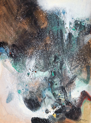 In this 1985 work “Hiver I”, Chu employed an impromptu approach, with his brush following wherever inspiration might lead it. The dark blue lines and patterns, executed in unrestrained, “flying” brushstrokes, and the sprinkles of white snowflakes dabbed across the composition, are all typical for Chu's trademark style, natural and smooth like moving clouds and flowing water. Meanwhile, the picture breathes a freedom of spirit through which we may well discern the atmosphere of winter in Europe. Yet this is also where Chu adds his own ingenious touch, for he subtly brightens the often dark and harsh mood of a lonely winter landscape in northern regions with small dabs of yellow and red, thus adding a more vigorous flair to the predominantly white and blue palette. Tang poet Cen Shen wrote, “It is as if suddenly one night a spring wind would rise, and scatter the blossoms from thousands and thousands of pear trees”, using a springtime image as a metaphor for the beauty of the earth covered under a thick layer of snow. In “Hiver I”, Chu does something very similar when he employs unique shades of color and gently undulating lines to create a litheness and rhythmic harmony that makes the observer acutely aware of the stunning beauty that is a winter landscape.