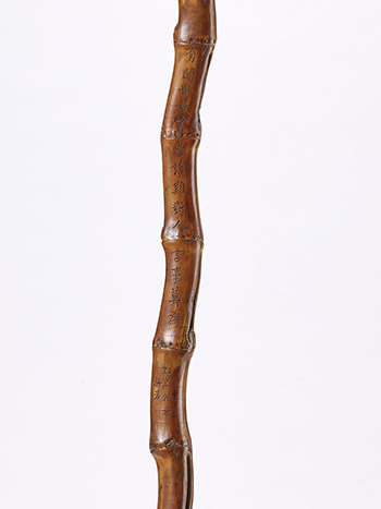 此手杖以一長條近乎筆直之竹子根部地下莖(稱「竹鞭」)製成,實屬鮮見。竹杖釋文:有容乃大;有忍乃有濟;有三公不易之介;有關世教書宜讀;行事莫將天理錯,無欲則剛;無愛即無憂;無一藝自用乃高;雖對人言事莫違;立身當與古人爭。乙已仲秋梅岩