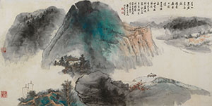 款識:青山翠碧秀無厭,賴看扁舟日往返。上島溫泉水雲招待所重修落成。應該處餘分局長家偉索圖補壁。六十五年丙辰閏八月吉日,孫雲生家瑞於蘭園別墅。