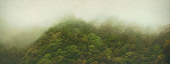 近看成画,远看成景,山头云雾渺渺,半掩还绿的青葱林木蕴借着画者的精神,叶子奇的绘画艺术在当代感强烈的造景构图中,有着古典写实的技法,但画面所营造的氛围却是中国古代文人山水画的写意造境,巧妙的跨越中西藩篱,发展出艺术家自身独特的当代风景。