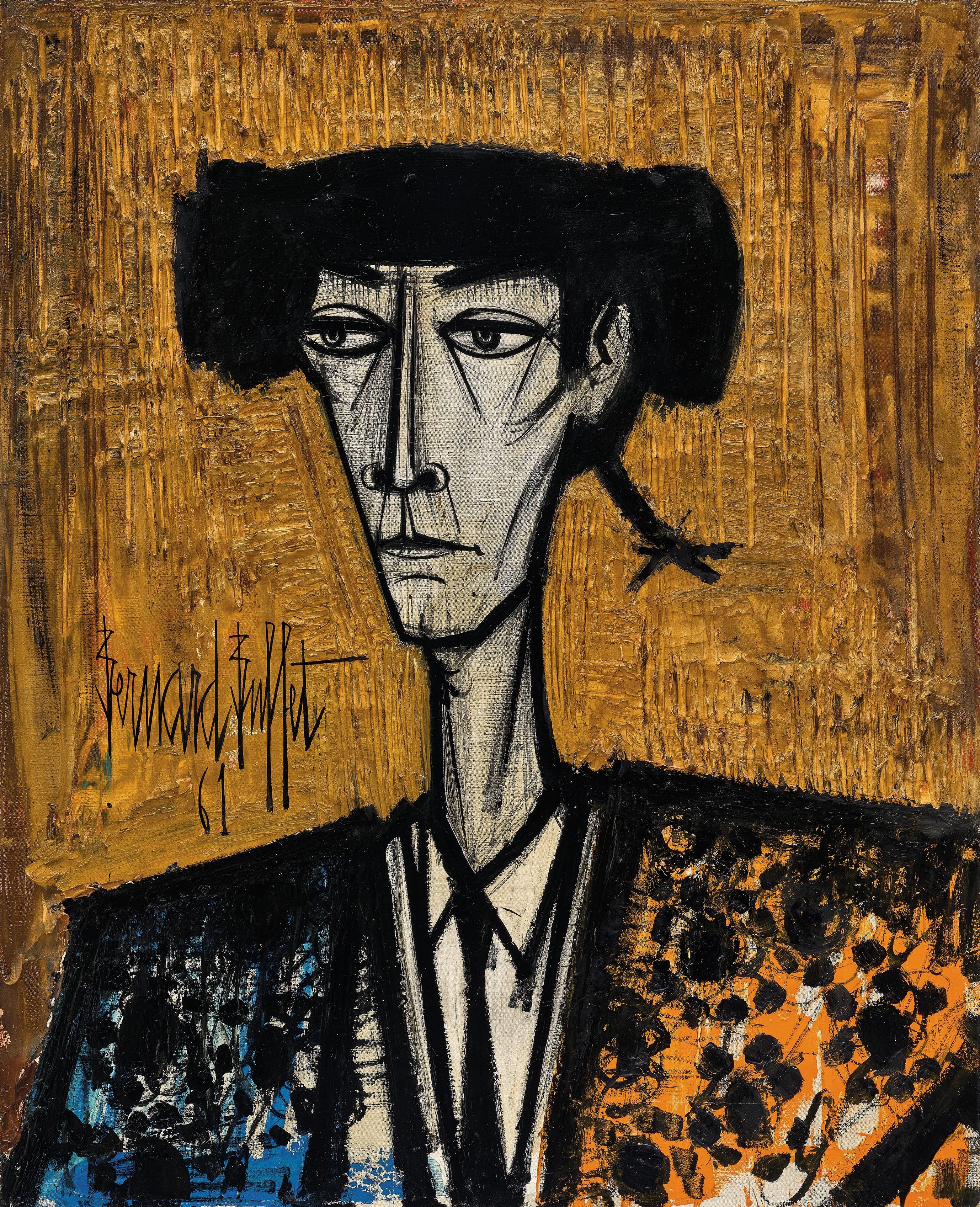 貝爾納.畢費(Bernard Buffet)被譽為「戰後表現主義泰斗」、「法國寫實主義繪畫的接班人」,曾為《藝術鑑賞雜誌》選為「戰後十大最傑出藝術家」之首。日本收藏家岡野喜一郎尊畢費為「法國藝術的教宗」,為其建造個人美術館。畢費的聲名遠播,一生為鎂光燈追捧,支持者遍佈全球五洲。二戰期間,青年畢費筆下多以靜物、自畫像、家鄉風景和工作室為主題。法國總統席哈克亦道:「畢費具體地呈現了法國戰後的苦難,全心全意地表達虛弱、痛苦與貧窮的情況。」戰後經濟環境的好轉,反映在畫家豐富的題材,例如:鬥牛士、馬戲團、知名歷史場景,也相承他於高等美院、羅浮宮為名作薰陶的經歷。旺盛的創作慾望,催生激情澎湃的成果,一舉成名的成功,讓畢費被譽為天才。一生逾八千件作品,數量豐沛如洪水沖積,肥沃了渴求刺激的藝壇,也契合當時社會對藝術再度引領人類精神的冀盼。近年,主要交易市場,畢費並列印象派、巴黎畫派等經典藝術之位,尤以1950-1960 年代作品屢創佳績,而「鬥牛士」系列則是當中代表性主題。1958 年畢費三十而立,名聲鵲起,首次舉辦個人回顧展,至今廣受全球藏家愛戴、氣勢軒昂的經典主題「鬥牛士」系列也在同年展開。畢費是為「鬥牛」的愛好者,他對這項西班牙的傳統文化有著無比的激情。歷史中也不乏西班牙名家,包含畢卡索(Pablo Picasso)、奧斯卡. 多明格斯(Oscar Dominquez)、馬諾洛.米拉雷斯(Manolo Millares)等人,引此為創作靈感。畢費在普羅旺斯地區買下莊園定居,鄰近西班牙國界,該區域也有著豐富的鬥牛文化。畢費邀請夫人安娜貝爾作為模特兒,穿著鬥士裝束於工作室佈置場景,模擬鬥士不同動作的颯爽英姿。「貝爾納帶領我進入鬥牛的世界... 第一次觀賞時,我馬上著迷於那驚人的藝術性。... 現在想想,當模特兒的時光,也像昨天才發生的事。」- 安娜貝爾.畢費。