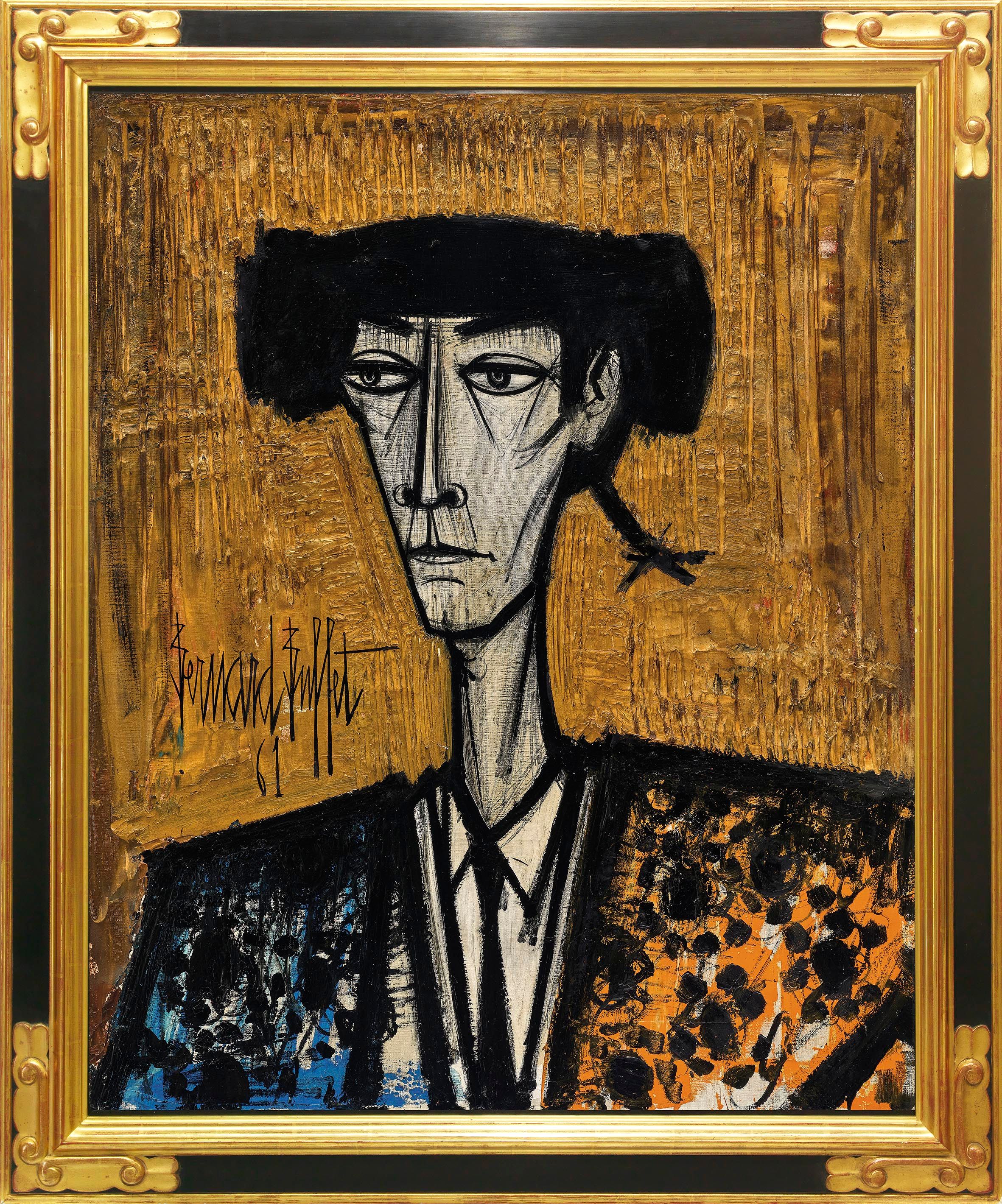 2016 年十月巴黎市立美術館舉辦「畢費回顧展」,入口處以1966 年創作總長達5 米5,高度2 米5 的巨型《鬥牛─單膝下跪》畫作迎賓,該鬥士群像充滿戲劇張力,神聖且不容侵犯。如此磅礡的開場,猶如親臨鬥牛場的熱血澎湃,震攝每一位參觀群眾。1967 年大衛與賈尼耶畫廊,舉辦「鬥牛士」主題個展,若說畢費描繪的小丑,生於戰爭傷痛與人性疏離的反思,華麗高昂的鬥牛士主題,就是呼應著1950-1960 年代法國社會,青年思想運動,音樂、電影、文學、美術的人文薈萃時期。本季羅芙奧秋拍「薈萃國際專場」拍品編號038《鬥牛士》(Tête de Toréro)創作於1961 年個性化鬥士面部表情的傑作。有別於1950 年代末期同系列畫作,著重在人物姿態的側寫,此期作品強調人物精神性的高貴肅穆。此作由法國代理賈尼耶畫廊,收錄於基金會文獻檔案。自1990 年代起為亞洲私人珍藏。畫作背景層次豐富,黃褐色凸顯人物深邃堅毅的表情,直式構圖更顯情緒張力。人物身著華麗服飾,頭頂貴族黑帽。堅挺造型如威武鎧甲,捲曲黑線勾勒細節,粗細交錯營造陰影立體感。華服鬥士與盛怒公牛緊張對峙的高潮,全場群眾激情澎湃,場上充滿暴力的慾望之舞,都為藝術家凝練為人物精神性的隱喻,確為畢費最精彩的肖像藝術。