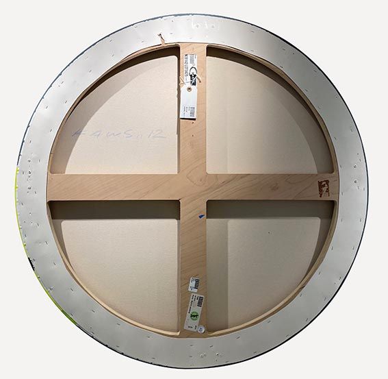 Similarly, KAWSBOB is also the favorite image or symbol of KAWS. By combining the XX eyes unique to KAWS, what is known as SpongeBob SquarePants turns into KAWSBOB. The large and round composition of Don't Sink consists of a small circle surrounded by a bigger circle. The offcenter focus is on one of the round eyes of SpongeBob SquarePants. The application of gray color on a large area lowers the foundation color tone, forming a contrast with the neon color. The three red dots break the stillness, becoming part of the abstract painting with geometric aesthetics in combination with the eyes and the sponge pores in the overall composition of the round canvas.