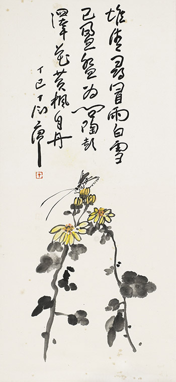 《黃菊絡緯》中洋洋灑灑的草書與黃菊絡緯相結合,結構緊湊,書畫者的悠然自得與嫺熟深厚的功底在筆落尖娓娓道來。《蘭竹雙清水仙蚱蜢》 (Lot608)畫面中雖寥寥數筆卻意味無窮,竹幹與竹葉墨色濃淡有別,節奏輕重得當,竹葉下筆簡潔有力,方向明確,靜止的畫面顯得雀躍生動。畫面中水仙更是進一步發揚八大山人簡率、誇張的傾向,一抹成山,一筆成像,近乎信手塗鴉。筆墨間濃淡枯濕,墨分五色,淋漓盡致地表現於毫褚之間。