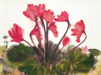 水彩畫《仙客來》為席德進晚期所作,有別於早期的線條感強烈,陽剛太過,晚期的線條融入書法概念,富有彈性,剛中帶柔,色彩淋漓,生命力充沛,抓住花卉的高雅姿態,令人讚嘆。