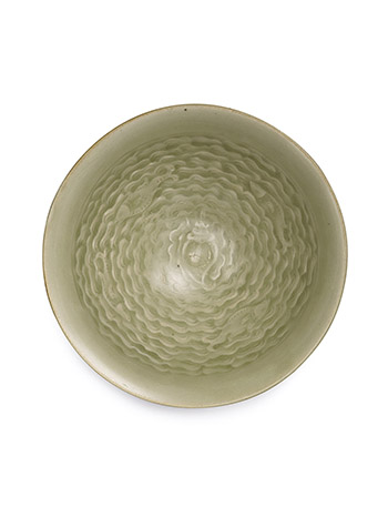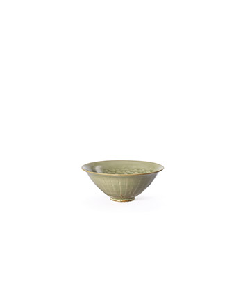 盞撇口,小圈足,器型呈現斗笠狀,整器通體施青釉,圈足底部一周無釉,露胎處可見灰褐色胎體,青釉色澤為黃綠色。外壁以圈足為中心剔刻線條紋飾環繞外壁一周,呈現放射狀。盞內壁模印海水游魚紋,海水紋飾模印清晰,給人以波濤洶湧之感,四條小魚分佈在盞四周,描繪出悠然遨遊的狀態,闡釋出「子非魚,焉知魚之樂」的哲學思想。