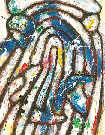 此拍品《作品》2013年完成創作,曾經展覽於東京白石畫廊前川強個展,歷經亞洲重要私人收藏,十分難得。底色白色帶來清新的視覺感,襯托蜿蜒黑線的源源生命力,搓擦創作過程的流線足跡。織品皺褶的層次肌理間,紅黃藍綠,錯落彩色寶石般的天然花紋,瑰麗色彩交互渲染,美不勝收。整體畫面宛若大氣脈動的生生不息,詮釋藝術家成熟階段的至真至美。