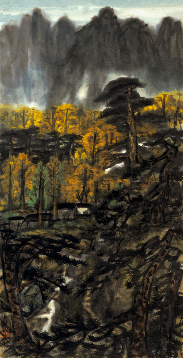 《黃山松濤圖》一作並非畫家的實景寫生,而是記憶中的山水印象集錦:黃山的壁裂千仞,化為遠處朦朧的山巒,留白的處理恰到好處;被秋色染得金黃的蓊鬱山林,則是歷歷在目,成為畫面最顯目的焦點,白牆黑瓦隱身在高聳的秋林之間,足見畫家對故鄉的追憶之情;蒼勁的松樹沿著山勢向上挺生,則吐露了畫家不屈不撓的風骨。晚年的畫家寄情於山水懷想,融入真情與詩意在其線條、造型與色彩結構之中,沒有過多的雕飾,僅有怡然自得的樸真寫意。