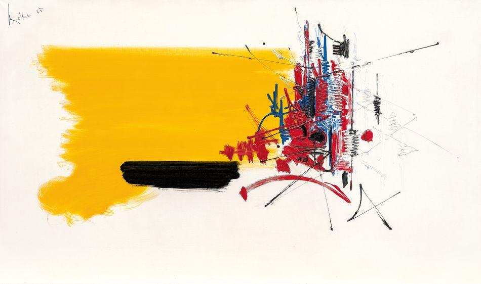 本拍品《雷神索爾》為馬修1960年代鼎盛時期之高雅傑作,充分展現其抒情抽象風格的精髓。畫面以柔和象牙白作為底色,為整體構圖提供清晰且透亮的空間感;鮮黃筆觸如雷霆般橫掃而過,氣勢磅礴,既奔放又不失節制,精準呈現馬修對速度與手勢控制的高度掌握。畫面右側紅、白、藍三色交錯成藝術家標誌性的動勢符號,彷彿將觀者的目光引向運動的軌跡,使畫布充滿律動感與視覺張力。墨色寬帶穿梭其中,既點綴畫面又以靜制動,巧妙平衡整體明快的基調,使快、慢之間形成張力與和諧共存的節奏。作品題名取自北歐神話雷神 Thor,不僅喚起力量、速度與超越的象徵意涵,也呼應馬修繪畫中那股雷霆般的巨大能量與瞬間爆發的創作儀式感