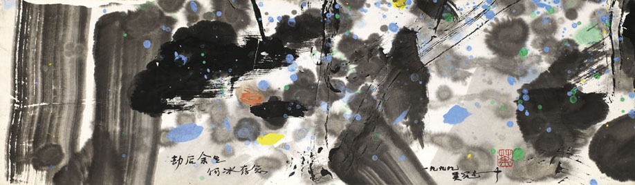《一方山水》乃吴冠中馈赠友人的佳作,画面左下书:「劫后余生,何冰存念」。大块面的墨迹与点彩其间的彩墨交相辉映,形成了丰富有致的节奏变化,中国的写意和西方的表现主义在方寸之间得到美妙的协调。