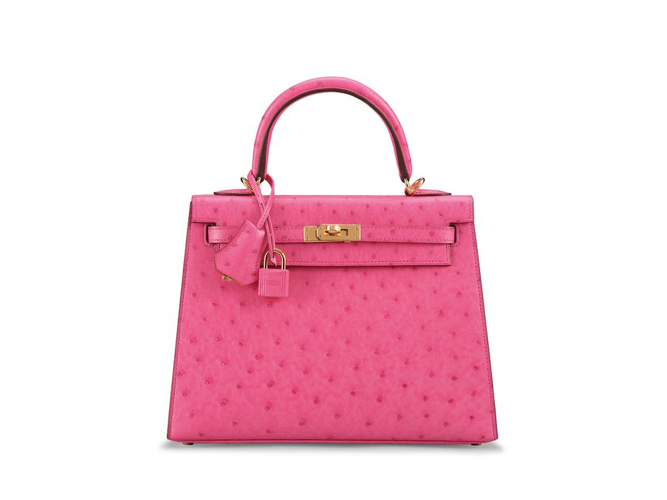 果糖粉色OSTRICH鴕鳥皮25公分外縫凱莉包附金色金屬配件