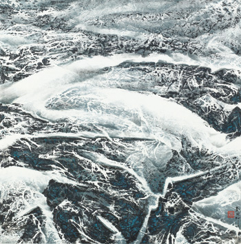 劉國松先生於2000年赴西藏珠穆朗瑪峰時,被眼前所見的雪山奇景所震撼而耽誤了回屋避寒的準確時刻,導致他左耳耳膜被凍傷從此失聰。所幸,此行卻萌發了他創作出氣韻生動,氣勢磅礡的西藏組曲系列,也算有失有得。《西藏系列之六十七-冰川》一圖,作於2005年,當時已值該系列創作技法及構圖上的成熟階段;畫作細節講究,精緻細膩處頗有傳統工筆畫作之功;而畫面上黑、灰、白三色交互穿插浮動,宛若迂迴閃爍的電光般迷幻動人。另外,畫面上風起雲湧的氣場流動亦令人激賞不已,頗能引起觀賞者蕩氣迴腸的感動。若隨意取局部放大觀賞,則一張畫可延伸為無數張不同的畫作,令人感到十分驚喜而可以一再玩味。《西藏系列之六十七-冰川》絕對是現代水墨山水畫的上品佳作。