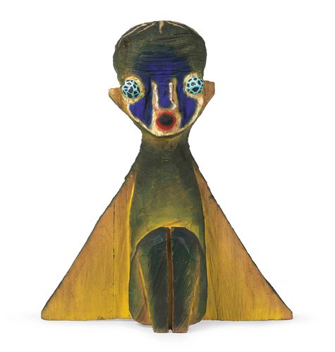 「繪畫應該像小朋友那樣隨意揮筆」加藤泉曾這樣描述,他喜歡古物,也喜歡逛博物館,尤其鍾情日本繩文時代的雕像固使加藤泉的作品特徵鮮明,時而雌雄同體、四肢纖長且姿態詭譎,彷若植物屬性卻又帶著動物般豐沛的生命力生長於土地的原始力量。2005年,加藤泉開始探索雕塑的三維空間,因此他開始了一系列木刻雕塑的創作,反覆出現的如神靈般的生物形象賦予了另一種形式的存在。他保留了木頭原始的質感,粗曠、原始有如充滿生命力的非洲雕塑,更為原生藝術的一種極致表現。此次秋拍羅芙奧現代與當代藝術敬獻加藤泉完成於2014的木雕作品《無題》,帶著風格化的蝙蝠翅膀及昆蟲網狀眼,怪誕且脫俗,亦表現出他對人類形象高度風格化的處理,使觀者面對藝術家於自然萬物的獨特詮釋,似人似神既親切又陌生的創作,嚴肅、靜謐卻充滿旺盛生命力,從平面到立體,從繪畫到雕塑,加藤泉自由豐富藝術特質創造出當代雕塑中無限大的可能性。