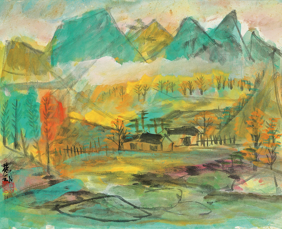 《晨曦》(秋山小屋圖)一作畫家把山峰畫成尖利的三角形,可看出立體派的影響;黑色線條紛披具拙趣,設色豐富、強烈、奔放,豔麗的黃、藍、橙紅,以及點染的玫瑰色,光影變化是由西畫轉換而來;整幅畫作的筆觸老辣、堅毅、蒼渾,尤其描寫山嵐籠罩的氤氳空間,仍有水墨表現的透明感,三兩小屋隱身林間,閒適優雅,無論景物、風格和畫法,都成為林風眠借景抒懷的載體。