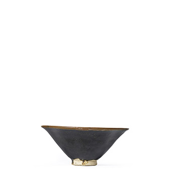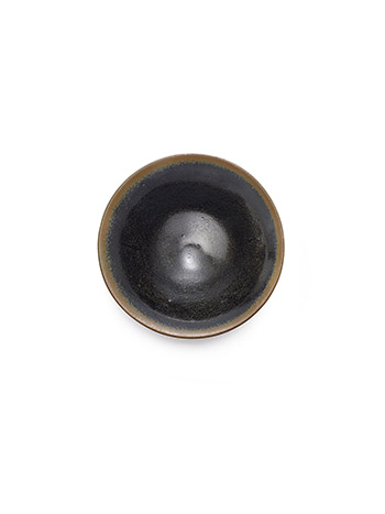 此盏斗笠形制,盏口外撇,深腹斜收,底部小圈足,盏口至圈足内外均施黑釉,釉色黑如膝,口沿一周呈现柿红色边缘,增添了此盏的美感,也彰显了此盏的身份。斗笠盏为宋代时期最为著名的茶盏器型,因为造型酷似斗笠而得名,器型优雅,颇受宋代文人喜爱。此盏造型经典,釉色古朴,满釉烧制更展示了此盏的高贵。