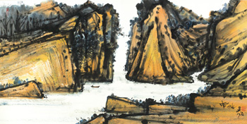席德進在《金色山水》作品中採用大膽的色彩,突破舊有的框架。粗黑線條的勾勒,仍可見其早年油畫創作時期,受表現主義畫家畢費(Bernard Buffet)的影響。台灣的山水被約簡成極具現代造型,乾濕筆交錯下,陡峭奇石的書墨皴法顯得氣勢不凡,富有生機。山谷間的微小扁舟,凸顯山脈的巍峨,作品呈現現藝術家的自信與孤芳自賞的特質。