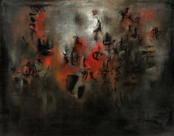 若對照巴黎龐畢度中心藏品《風》,用以表現樹葉的飄揚輕盈,同為龐畢度中心的同期代表作《火災》(Incendie),則是表現「火」的灼灼熱切的意象。國家博物館對趙無極甲骨文時期作品情有獨鍾,可想見其稀有難得。另一幅繪於1954年紅黑色調、張力十足的油畫《爭榮競秀》,則可視為畫家展現「土」的能量之作,符合「動中有靜、靜中有動」的禪學精神,追尋太極的真義。