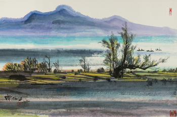 作品《淡江河畔》雖為彩墨畫作,但其實也揉合了水彩的渲染力,以及油彩的光線感。水光構圖的安排,可看出恩師林風眠的影響,但筆墨與色彩的運用,仍是十足的席德進個人特色。