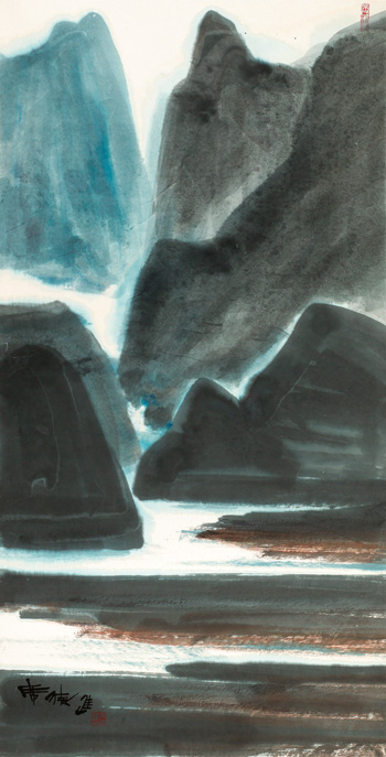 此幅《海山相照》為席德進作客摯友的家中所作,非實景寫生,而為憶寫之作。濃重的用色,凸顯山的宏偉,深淺不一的墨藍,富有層次,令人回味無窮。表現山水畫裡群山聳立的蒼鬱宏遠,用色濃重,大塊塗抹,有幾分向前輩李可染致敬之意。長形立軸的形制,接近正統文人書畫的結構,為席德進晚年山水圖繪的特色。然而他以現代的眼睛看山水,創造出新的造型與意志。