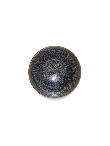 盞敞口,圈足,盞內外施黑釉,黑釉上點撒鐵鏽斑點釉色,鐵鏽斑不規則的分佈在盞中,猶如浩瀚星際。盞外施釉至圈足處,圈足露胎處塗有黑色護胎釉,為懷仁窯最為明顯的一個特徵。此種鐵鏽斑為宋代時期所創新的裝飾手法,宋金時期足見此種釉色工藝已經被成熟掌握,鐵鏽斑這種釉色更為宋人所喜愛。