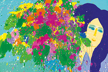 豪放不羈、享受生命的丁雄泉,自稱「採花大盜」,其創作忠於他生活裡最真純的感受,女人與花卉是他一生所愛,也是他最常畫的題材。1952年,23歲的丁雄泉即旅居巴黎,1958年前往紐約發展,2001年起定居阿姆斯特丹。生性豪邁且才氣縱橫的他,在各地藝術圈交友廣闊,創作受到當時不同藝術思潮的啟發,但他個人卻從未加入任何團體,自立於主流畫派之外,以鮮明的畫風與題材,樹立了雅俗共賞、風靡中外的個人特色。《憂鬱的一天》展現了丁雄泉令人讚嘆的色彩掌握力,繽紛飽合的顏色構成充滿魔力的愉悅世界,他的寫意重在寫態,寫花的瑰麗曼妙、寫女子的柔媚嬌態,歌頌著生命的美好與感官的豐美。而花與女人懸浮在無法定義的藍色背景之中,有如凌駕於現實之外,既夢幻,又亮麗迷人,即便是憂愁著,也是雜帶著無盡甜美的愁思吧!