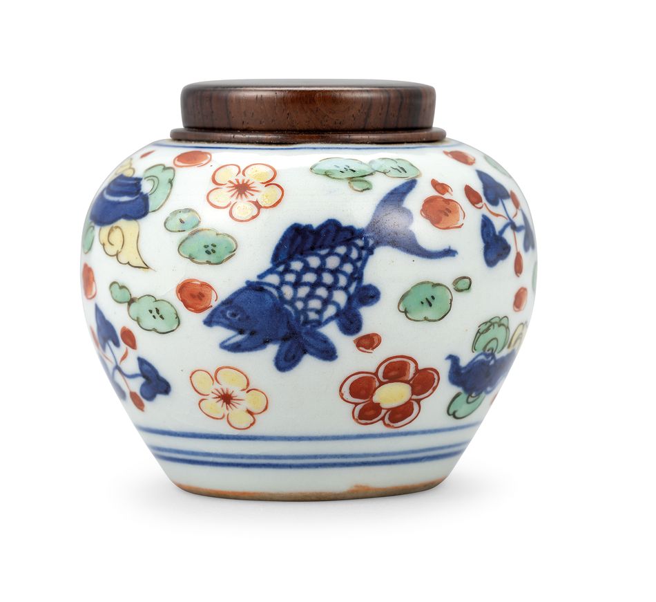 19世紀 青花五彩魚藻紋小罐《大明萬曆年製》仿款