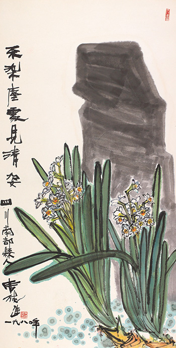 席德進用「現代眼」來觀察花,用不同的素材去表現,賦以新的意義與生命。水仙,冬末初春的花卉,中國詩人黃庭堅以「凌波仙子」形容。在席德進的筆下,水仙的姿態清盈優雅,堅毅自戀。他精心布局繪畫的空間,將墨韻轉化為色韻,以沉穩的筆勢勾勒,充實的內蘊,水仙花開,展現著茂盛的生機。