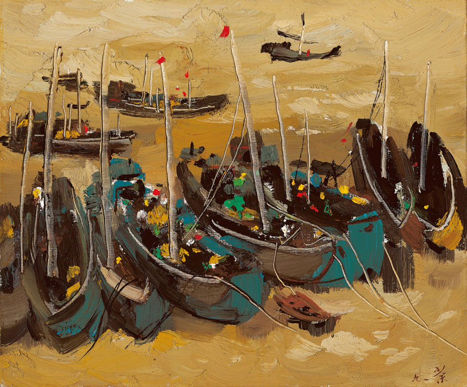 吳冠中的繪畫兼具西方抽象形式美感及中國文人抒情意境,他認為詩畫本合一,在傳統文學或古畫裡,「船」是承載中國詩詞和繪畫靈感的母體。「『野渡無人舟自橫』,孤舟閑飄在寂寞的水面,倒影清晰,靜穆入畫,詩與畫之美於此悄悄相依。我畫過無數的舟船,從紹興的烏篷船到太湖的帆影,從舟山群島林立的桅檣到長江山城的遊輪,從秦皇島的打漁船到印尼的突著大眼睛的彩艇......水上那飄浮的船體被蕩漾的水波搖晃著,形象瞬息多變,兼備具象與抽象之美感。《清明上河圖》中筆筆精到地刻畫了擁擠的船群之結構,但同時掌握了其間整體造型之組織美。船在中國詩詞和繪畫中長期是啟發靈感之母體,『只恐雙溪舴艋舟,載不動許多愁』,成為千古絕唱。」(摘錄自〈吳冠中繪畫談:漁港〉一文)因此,對於講究詩意美感的吳冠中而言,舟船所代表的意義不僅止於形式美感而已。這幅作品以漁場幾艘停泊的舟船入畫,採用東方寫意的方式描繪種豐收的意涵,船舷、桅繩並陳別具有結構的美感,海波、船體的色彩繽紛,將畫面濃縮成漁民生活的富足意象。風格特出的吳氏海景畫,在簡潔中處處展現大家風範。