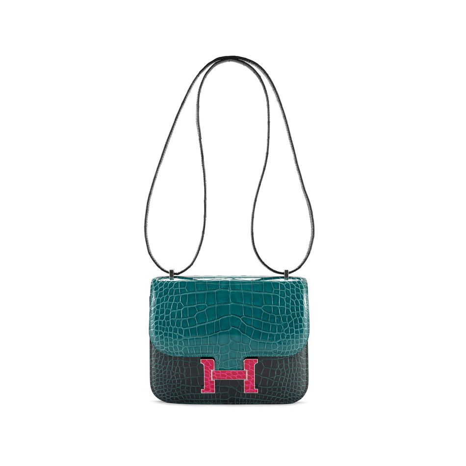 限量版亮面盧梭綠色、博斯海峽綠色及紫玫瑰色ALLIGATOR短吻鱷皮18公分迷你CONSTANCE包附銀色金屬配件