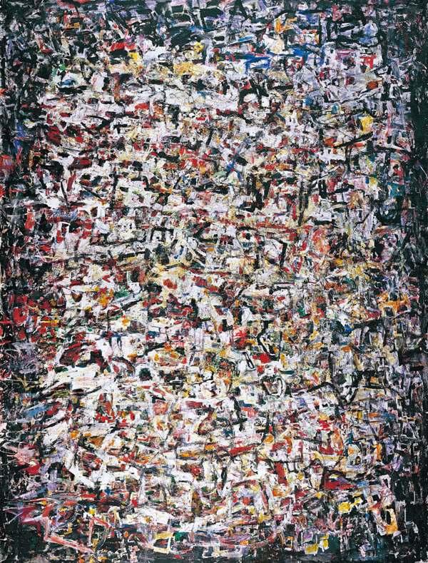 作品《抽象構成》一方面具有托比白色書寫的神祕多義性,內涵本質更貼近東方;而另一方面又帶有帕洛克自由線條的表現性演出,強化形色變奏後的壯麗效果。《抽象構成》在材質上採用油彩、拼貼完成,緊密厚實、色彩斑斕,交織成一首雄渾的交響樂曲,讚頌歷史文明的輝煌燦爛。畫家將甲骨、鐘鼎、碑刻、篆銘的各種漢字書體,變體為具有現代意涵的抽象圖式,尤其畫家在後期作品融合繽紛的色彩、線條,豐富的肌理、宛如織錦的形式益加自由圓熟,乃為表現性強的抽象繪畫。