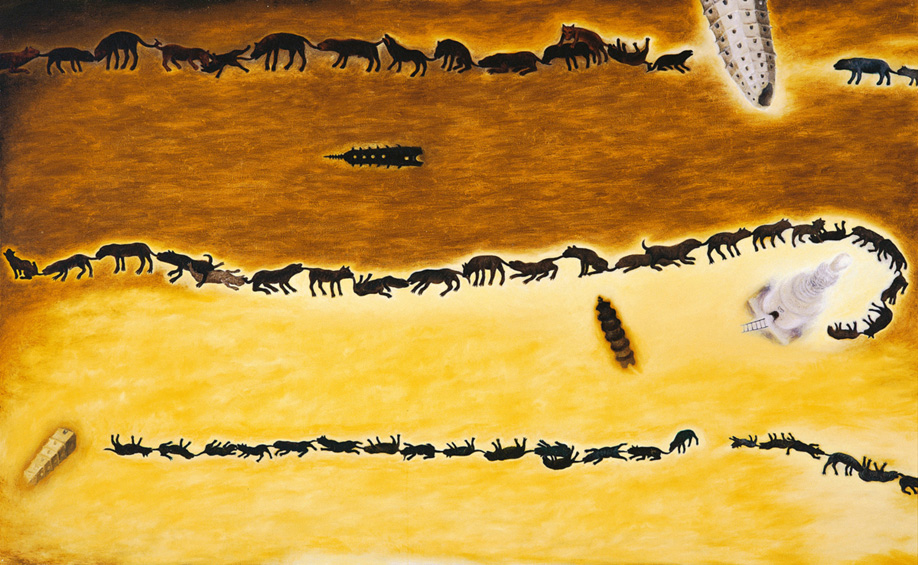 雖然蘇旺伸沒有什麼淑世的理想或使命,亦不願說教般地揭示什麼公義真理,但一個成長成熟於80年代的青年,曾經深深體會到台灣社會的劇烈變化,那強烈與深刻的感知,使他對自身所從出的土地,仍然充滿關懷,這種老靈魂的特質無從擺脫。於是,他紀錄下這些心情,以各種抽象的化身與曲折的形式,暗示著在畫布背後複雜糾結的可能,像一則起了頭即嘎然而止的預言,留予不同的心靈演譯將之完成。無論從內容或為它們命名的方式,蘇旺伸此前的作品中對社會性議題的關注都是較為外險的,而在這件作品中,更多的是內省式的精神觀照,他們依然根植於畫家的生命境遇,只是那思維的面向更為複雜與深沉少了一些嘲謔,多了一絲感傷,卻是一般的無所謂。