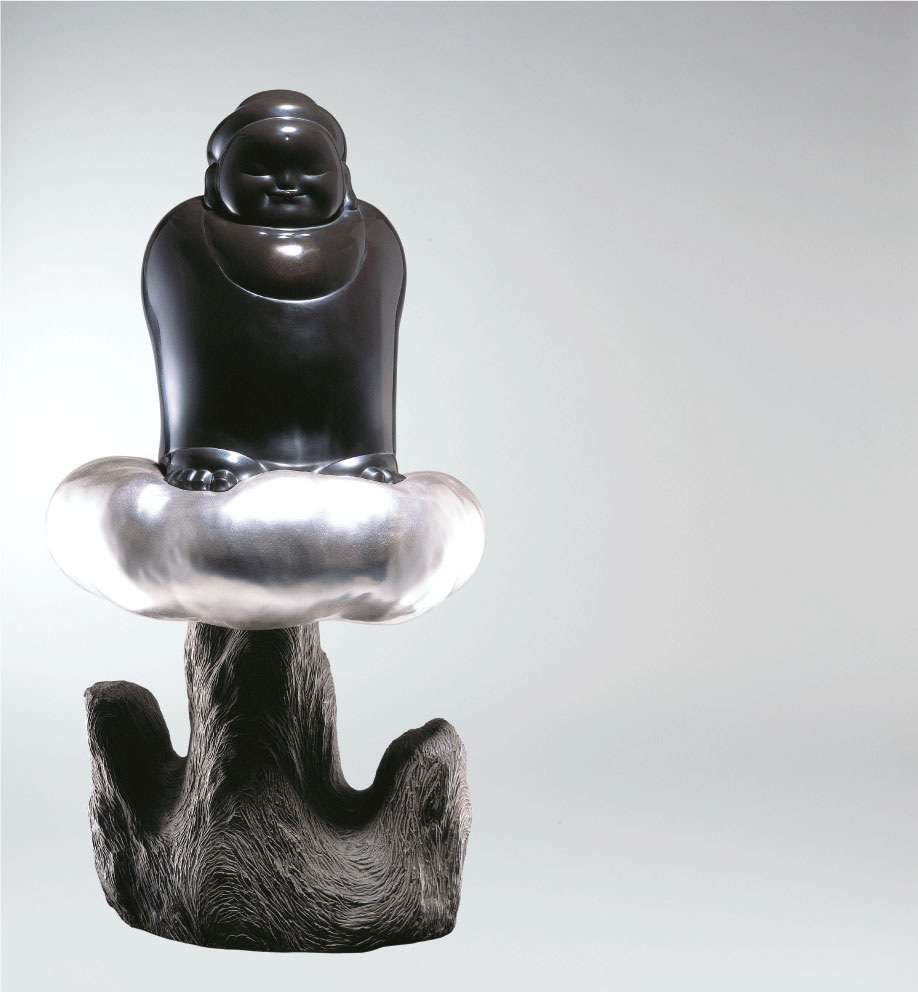 2003年的《清涼山》,人物在山峰雲端,若有仙氣;雕塑的底座為一座山,乃轉化自中國象形文字的「山」。清涼山也稱五臺山,山勢高聳、通達天際,以「清涼」為名表避俗之意。李真用山的高聳和雲的飄渺,將精神境界之高予以視覺化,他追求的即是如此完美絕俗的精神層次,因而人物雙手負背而立,飄然佇立於山巔雲頂,神情形態自若愜意,不由得發出一抹微笑。李真擅長處理此種量體輕重對應的關係:銀的溫潤與黑的能量,既對比又和諧;而雲朵卻是一個穩定的支撐物,讓人物在漂浮中獲得安定。