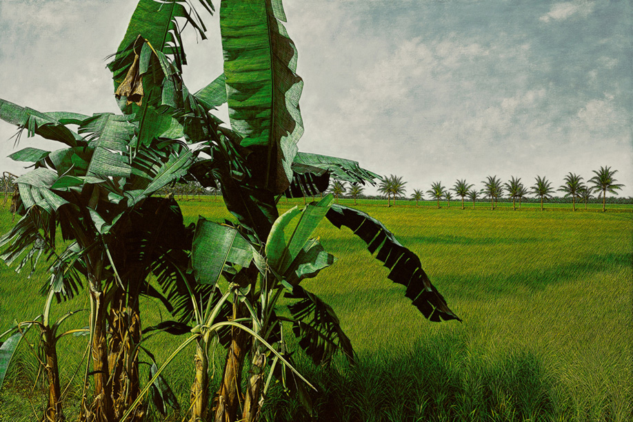 黄铭昌的作品从有时间、地域性的乡土写实迈向无时间隔阂的土地延伸,从室内生活空间的真虚搜索到窗外栏杆线外广大的宏观与细腻的微观,画家以个人的视宇铺陈出缤纷密密万物归怀的物我缱绻之情。归国后的"稻田系列"与"远眺系列",大同小异地覆述着静纯朴世界的眷恋,他的乡土写实不再是摄影镜头猎取下的切面空间,而是透过细致描绘与严谨结构组合出的乡土意象,一吋吋貂毛笔所犁过的画布,似乎意欲攫取住每一吋画面所能拥有的寂静,似幻似真地抗拒了外来世界的侵扰。他的稻秧正如家乡"瑞穗"知名,常年丰盛的成为记忆版图上的烙记,是一株株已在现实中逐渐消逝的乡土符号。现实中逝去的,黄铭昌在画面上挽留了。