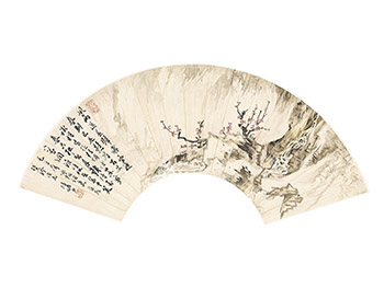 設色紙本 15 x 49 cm(扇面)款識:風雨送春歸,飛雪迎春到。已是懸崖百丈冰,猶有花枝俏。俏也不爭春,只把春來報。待到山花爛漫時,她在叢中笑。毛主席《詠梅》詞意。畫為慧珍同志,陸儼少。鈐印:就新(左上)鈐印:儼少(左下)