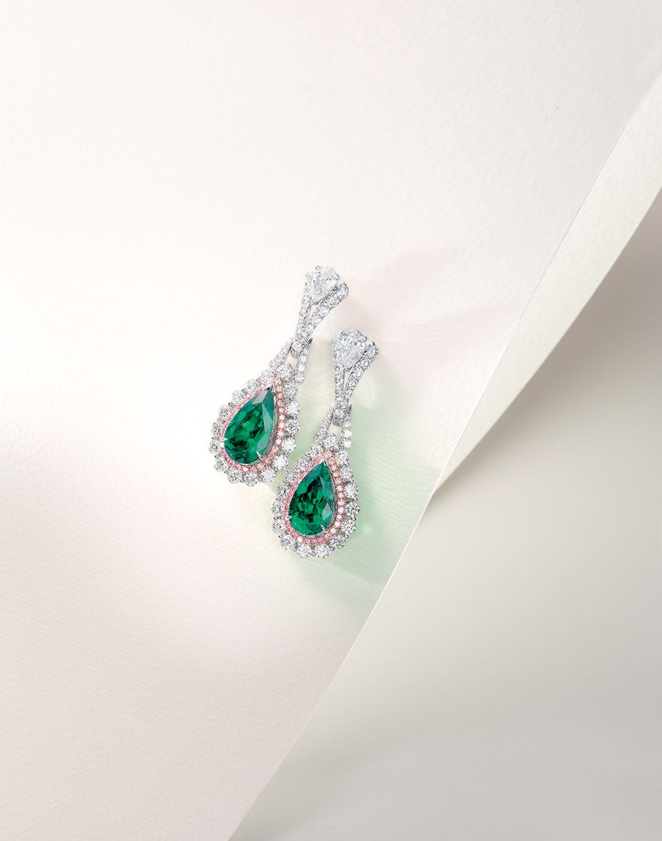 1.66克拉及1.72克拉梨形哥倫比亞祖母綠配粉紅色鑽石耳環 MUZO礦區,無浸油,附MUZO、SSEF證書