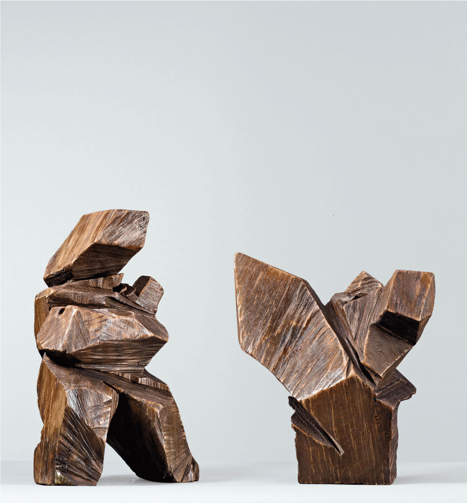 朱銘的「太極系列」大致分為兩大類,一類展現個體的技巧與姿態,另一類則講求兩股力量之間的對立關係,也就是雙人對打。在單一人物的太極雕塑中,太極的力量和節奏透過身體的運動和姿勢來表達。但太極在本質上可謂兩極相生,即「陰」與「陽」,兩極相互關聯,循環往復合而為一,構成和諧而有力的運動。此件《太極系列》動靜、虛實之間,將太極拳隨屈就伸、人剛我柔、借人之力、順人之勢的精義顯露無疑。
