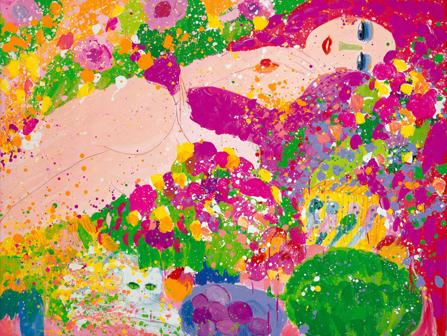 From this title it is clear to see that Walasse Ting is trying to deliver delightful and comfortable feelings. To avoid regrets by missing any detail, Ting, like many artists, keeps on exploring the things with which he is fascinated. It seems that every object in this world cannot wait to become a part of his paintings. Ting is gifted with an un-acquirable instinct, or say power, to create abundantly rich and colorful images. "It is Very Hot Here" is a large painting, which makes it so vivid that the viewers can almost see Ting's passion overflowing. Ting's artwork always provides astonishing visual images, which make viewers step into a magnificent wonderland. The women with bashful facial expressions and postures in his paintings masterly deliver their emotions and the artist's passion. The manipulation of Ting's commonly used acrylic fiber materials creates a complete and beautiful disposition of colors.