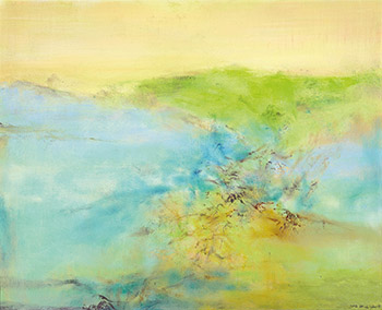 或許是藝術家心中的智慧豁達,二十一世紀,趙無極收斂起過往作品中矛盾衝撞的激越情感,昇華了曾經的彭湃與掙扎,色彩漸趨亮麗柔合,他的筆法結構依舊嚴謹大器,卻將浩然天地之間的無形力量隱藏於寧靜悠然的氣質之下,雖然不在張揚外顯,卻從未消失。《18.02.2002》採中心式的構圖,凝聚於畫面中央的深色筆觸輕盈薄透,有著跳躍奔騰的速度感,同時鏗鏘若金石之勢,流露出藝術家自1950年代甲骨文時期延續而來的線條駕馭能力。整幅畫作以層次豐富的藍、綠、黃鋪陳而出,明亮的色彩各有表情,同時又互相和協地交錯聚合,衍生出細膩多變的韻緻,如風般飄渺無形,流動於大氣之中。相較於趙無極早期的作品,光的比重勝過於影,大器磅礡之中,有了一種清新、適意的和諧靜謐。於是,在無垠穹蒼裡的某一處,無形的力量正匯聚變幻,輕柔祥和中蘊藏著無限堅韌的光燦力量。