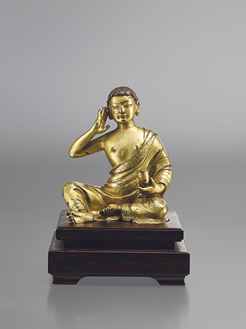 此造像頭留捲曲的短髮,面容圓潤,神情祥和自然。左手持角杯,右手置於耳側,似在演唱道歌,神態生動傳神。米拉日巴尊者往昔說過「牛角歌」,以牛角度化熱瓊巴,所以在造像中米拉日巴尊者手持牛角的形象。而然此拍品中上師面容方正圓潤,身著袒右式長袍,衣紋上有精美的圖案,雙腿遊戲姿坐。身材勻稱合度,衣褶線條流暢,製作工藝精巧,具有很強的藝術感。