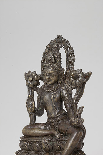 这一尊菩萨坐像,从风格上讲极具印度帕拉风格,所谓帕拉风格造像是指东北印度的帕拉王朝(Pala)所造的佛像。公元8世纪帕拉王朝建立于印度东北地区,是一个高度佛教化的国家,也是印度佛教最后的守护国。其作品是在笈多风格的基础上加入更多的密教元素,由于做工精湛,肢体表现丰富,神态活泼,极富美感,对尼泊尔和西藏佛像的风格有很大的影响,此尊即为藏地出品的帕拉风格的佛教雕刻艺术品。莲花手观音,手持青莲象征清净无染,故而得名。游戏姿式坐于莲花台上,足下踩莲花。姿态闭适自得,仰覆式莲花座,莲瓣圆润光华,如杏仁一般。头后衬火焰纹背光。