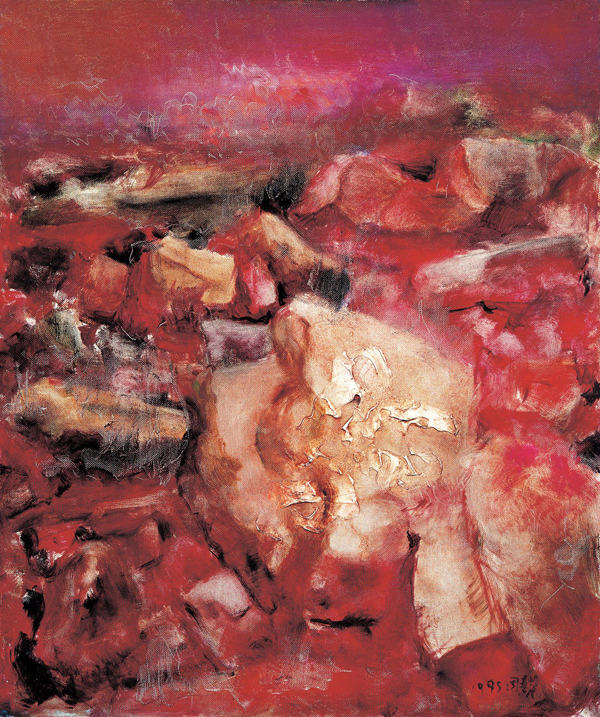 周春芽被認為是中國當代藝術界中對色彩把握最好的畫家之一,反自然色彩的運用是他作品中的典型風格。90年代初,周春芽以花卉、山石為繪畫主題,畫家借助德國新表現主義的繪畫方式、技巧,大膽用色使畫增添異彩,以濃豔的紅色重新詮釋山石和花卉,面貌迥然相異,顏色跟自然不同,放於畫面大片的空白中,筆法精練,個體抽象獨立,表面被一層奇怪的增生物覆蓋,暗示出模糊的天然本性並詮譯了文人繪畫「溫和、內向、惰性」。