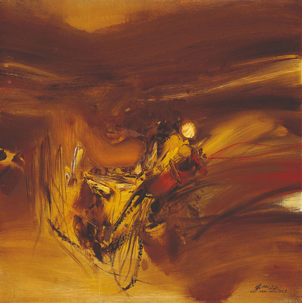 朱德群自1956年開始嘗試抽象畫,結合自身中國書法的涵養,加之感染西方抽象畫的奔放自在,朱德群在很短的時間內完成了具象到抽象的過渡。到了1960年代,朱德群已在巴黎確立了他的地位,正值盛年的他,創造生涯也正邁向顛峰。美國堪薩斯大學美術史系名譽教授李鑄晉先生曾如是描述朱德群1960年代的作品:「那時的畫,他多以單一色做背景,畫面四周多用闊筆和快筆構成種種方向,有時略似天空的雲彩,有時像山上的瀑布,有時像山石和荒野,而在其中他用較細的筆,用靈活變化的線條及厚重的色彩,點出許多動作,有時還有點德施代爾的風格,但多數都是中國書法和山水的意味,整個的畫面已顯示了個人的特質與風格,直至如今,都還保持著」。 (參閱李鑄晉<朱德群的抽象世界>,《朱德群近作展1985-1996》,台北市立美術館,1997年11月,頁26)