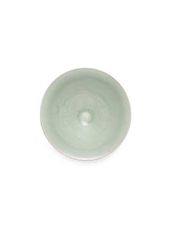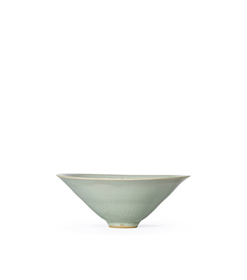 D: 13.5 cm H: 5.5 cm 盞斗笠型製,盞口外撇,深腹斜收,底部小圈足。盞口至圈足皆施青釉,釉面均勻,釉色如梅子青色。斗笠盞為宋代最為著名的茶盞造型,因造型酷似斗笠而得名。器形優雅,頗受宋代文人的喜愛。此盞造型經典,釉色古樸,彰顯了宋代文人精緻生活的縮影。