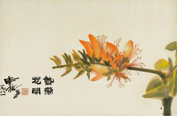 《熱帶花開》作品創作於1981年,為席德進到台中大明中學校園寫生。畫中描繪的熱帶花卉就是「珊瑚刺桐」,花形如火鳥一般,適合開在熱帶或屬於夏季的時節。珊瑚刺桐在畫家的巧妙經營,無比纖巧可愛,也顯現朝氣蓬勃的姿態。