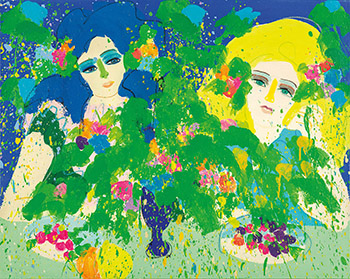 丁雄泉難得的畫布作品《迷雅與愛麗克絲》,以一左一右兩位女子為主角,構圖豐富完整,用色飽滿而不混亂,足見藝術家下筆之用心。畫中金髮女子為藝術家的女兒迷雅,而藍髮女子則是藝術家的女性友人愛麗克絲。丁雄泉作畫從不自限於追求形似,而著重於創造心中所見之美,《迷雅與愛麗克絲》亦不例外,藝術家以迷雅和愛麗克絲為模特兒,卻將深色髮的迷雅畫成金髮女子,並賦予愛麗克絲深邃的藍髮,再次印證其不重寫形而重寫意的創作模式。於是,畫中金髮女子一雙碧眼溫柔地望向觀者,明媚熱情,而藍髮女子則支頤凝望它處,似乎若有所思,顯得神秘而典雅,兩人皆嫵媚萬千,卻各自展現不同的風情。她們豐盈的秀髮間綴以鮮花綠葉,面前的桌面上是酒杯及鮮豔欲滴的水果,呼應了女子的青春,翠綠的葉子自兩位女子之間恣意漫延開來,掩映紅、桃、橙、藍各色花朵,繽紛耀眼而充滿生命力。丁雄泉以幾近平塗的手法揮灑薄透純粹的色彩,色彩筆觸本身即帶有活潑快速的韻律感,如此鋪陳而出的畫面缺乏景深,卻層次豐富,飽滿亮麗的色彩似乎要滿溢到畫面之外,無法定義的時空場景,更為畫面增添了如夢的氛圍。