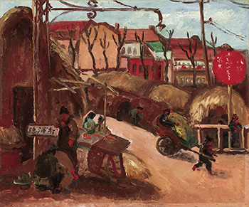 上海,是民國初年現代藝術激盪生發之處,而當年正值三十幾歲盛年之時的陳澄波正是在這座摩登都市裡,有意識地棄絕以往在東京接受美術訓練的日本風以及透過日本學習而來的西洋風,轉而師法水墨傳統,為油畫注入新穎創作觀點,進而創造其個人藝術生涯的關鍵轉折。於是,他的作品裡有了水墨線條的趣味,例如《街景》中的街燈、電線桿與禿樹,而以往繽紛亮麗的色彩也轉為以黃褐、紅褐色調為主,顯出一種古樸的氛圍。構圖上,我們看到陳澄波不再遵守學院裡習得的單點透視,而是採用如同山水畫的多重視角,近景的街道蜿蜒而上,路樹與遠方的樓房層層相疊,富有層次感,展現了陳澄波融混中西藝術元素與強烈主觀意識的獨特風格。