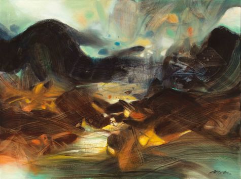此幅1989年的《光之旋回》,濃郁實在的大地色澤佈滿畫布領域,其他清淡爽朗的色澤則一絲絲地探出頭,色調即使沒有明確外形的包裝,朱德群做到讓它們仍有各自的神韻氣質,顏色本身就是一種暗示,而抽象的構圖是讓觀者自動自發想像的手段,觀賞朱德群的畫,你總會按捺不住想要天馬行空的慾望,畫家就像色彩的調酒師,他用他調配出來的組成物,邀請觀者的感官接收,緊接著是個人內在詩意的泉湧而出。