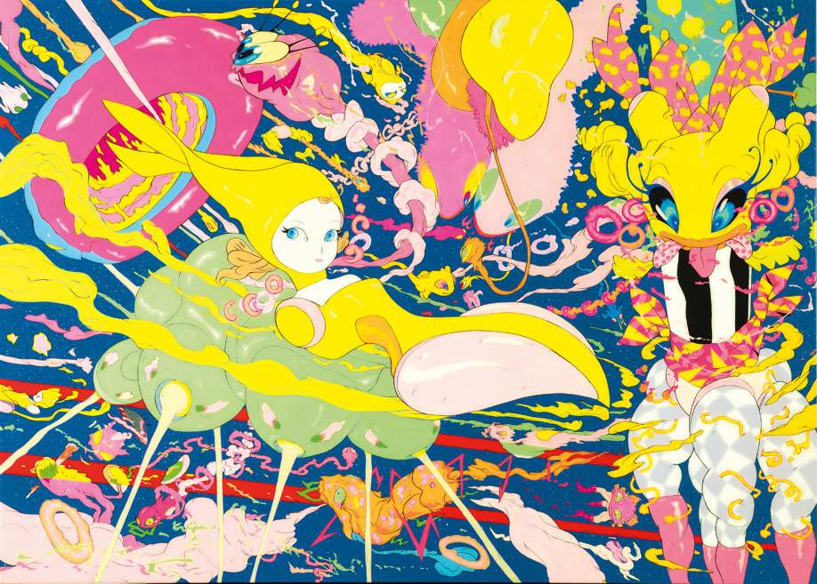 相較於日本浮世繪的妖魔表現傳統,或是美國漫畫中英雄打擊邪惡力量的描寫,《天界甜心S-II》中的妖怪猛獸已不是張牙舞爪,具有毀滅性的攻擊角色,畫面右方的怪物如丑角一般,身上的格紋裝飾、頭上打個蝴蝶結、俏皮地吐出舌頭,像是孩子的大玩具。畫面中鋪陳著糖果般的螢光對比色彩,與熱鬧喧騰的線條構圖,透過鋁板與烤漆的媒材表現呈現出炫目而潔淨的未來感,在天野喜孝想像飛馳的筆下開展。諸眾所往的夢幻天界,不再是英雄救贖世人的孤獨戰場,而是神祕狂喜的超現實虛擬樂園。